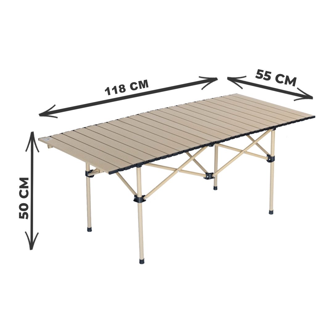 Table pliante grand format 118×55×50 cm, stable et pliable, idéale camping, plage et pique-nique, disponible en 2 couleurs.
